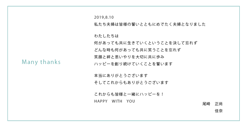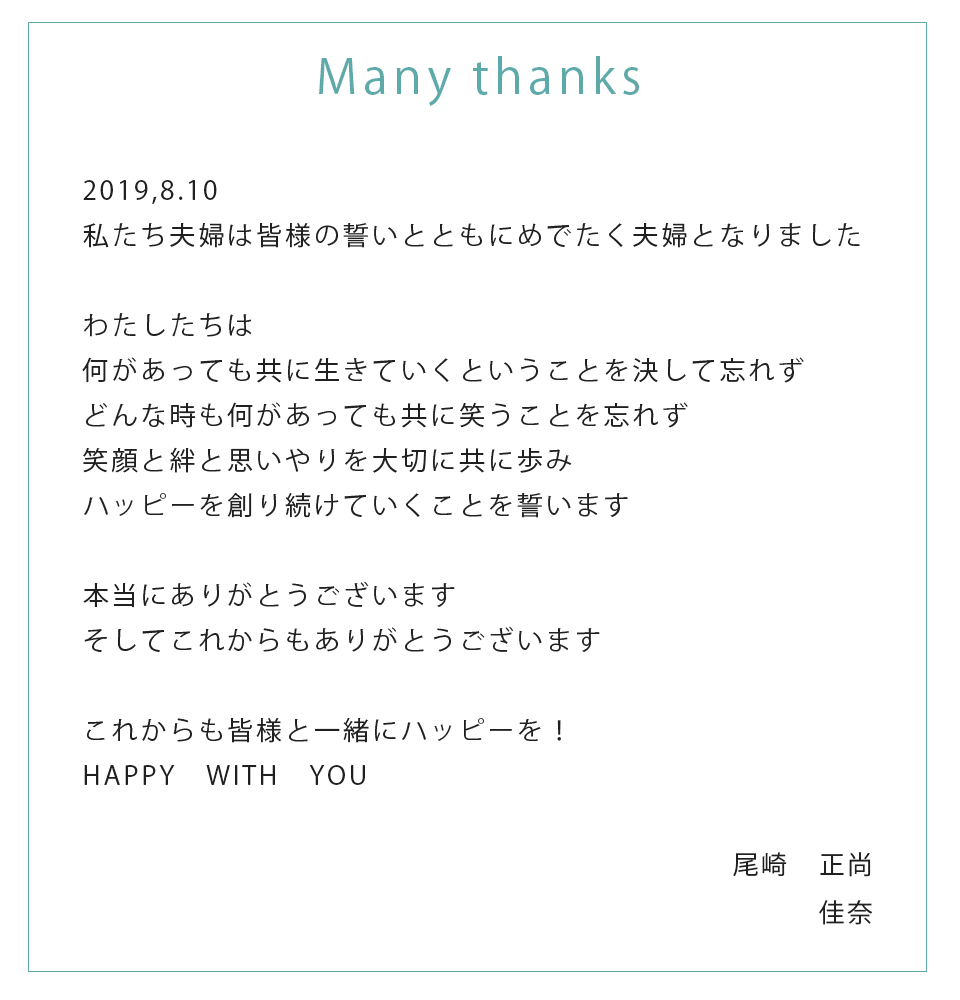 そして私たち夫婦だけでなく お互いの家族や仲間 その周りの人達もハッピーになるものにしたいと願っています